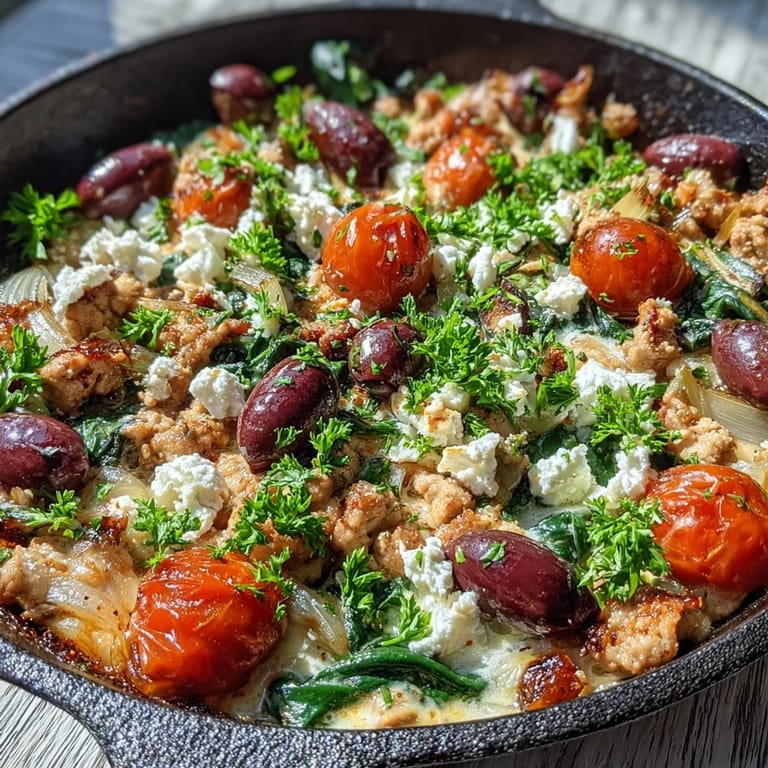 Save The smell of oregano hitting hot olive oil always pulls me straight into a Greek taverna mindset, even when I'm standing in my own cluttered kitchen on a Tuesday night. I threw this skillet together one evening when I had ground chicken thawing and a jar of Kalamata olives staring at me from the fridge door. The feta was a last-minute crumble, and honestly, it turned the whole thing from decent to something I actually texted my sister about. It's become my go-to when I want something fast, filling, and just a little bit sunny.