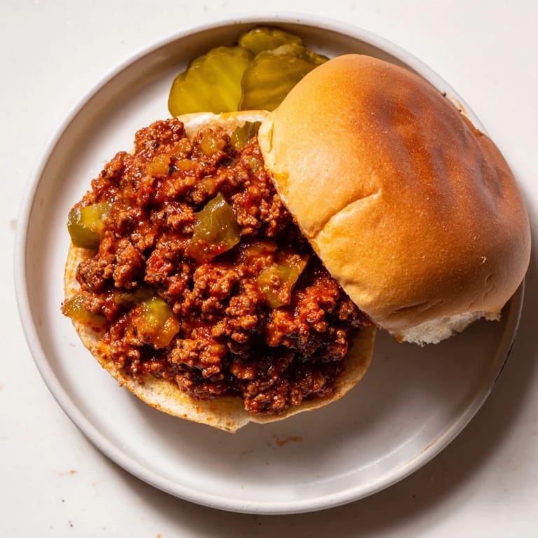- Split and lightly toast the buns so they're warm and slightly crispy on the inside. Spoon the beef mixture generously onto the bottom half, add pickles if you want that vinegary crunch, and cap it with the top bun. Serve right away while everything is hot.