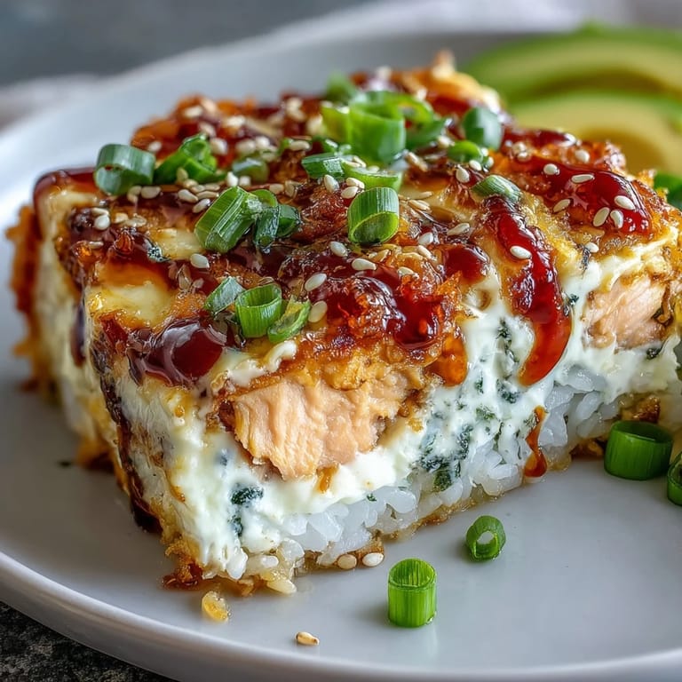 I've learned that this bake is endlessly flexible, which makes it perfect for feeding different people and moods. Add cucumber slices or pickled radish if you want crunch, swap the salmon for crab if that's your thing, or leave the cheese out entirely if dairy feels wrong that day. The core idea—seasoned rice, a creamy spiced protein, melted cheese, bright toppings—is a blueprint you can absolutely riff on, and that's kind of the whole point.